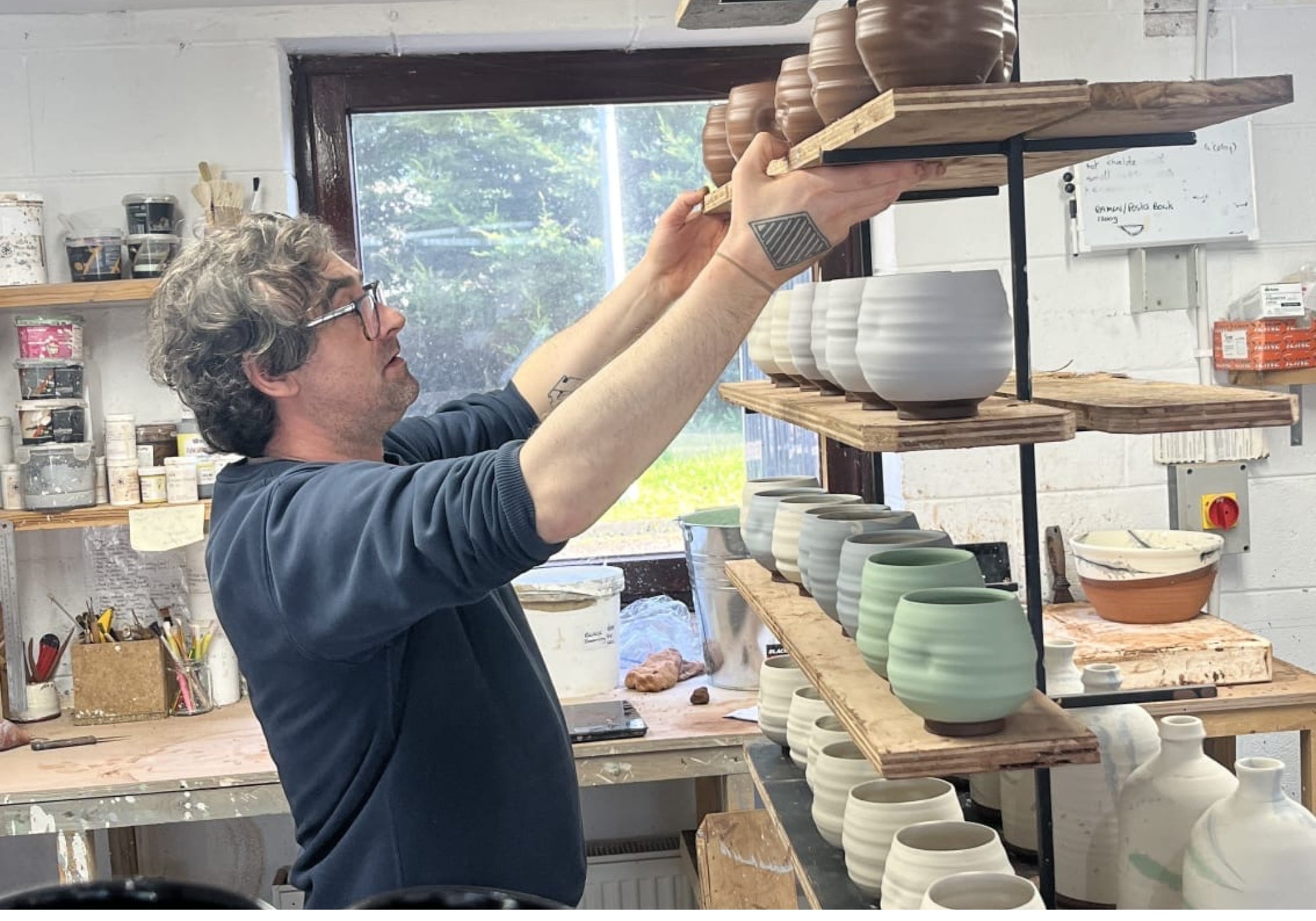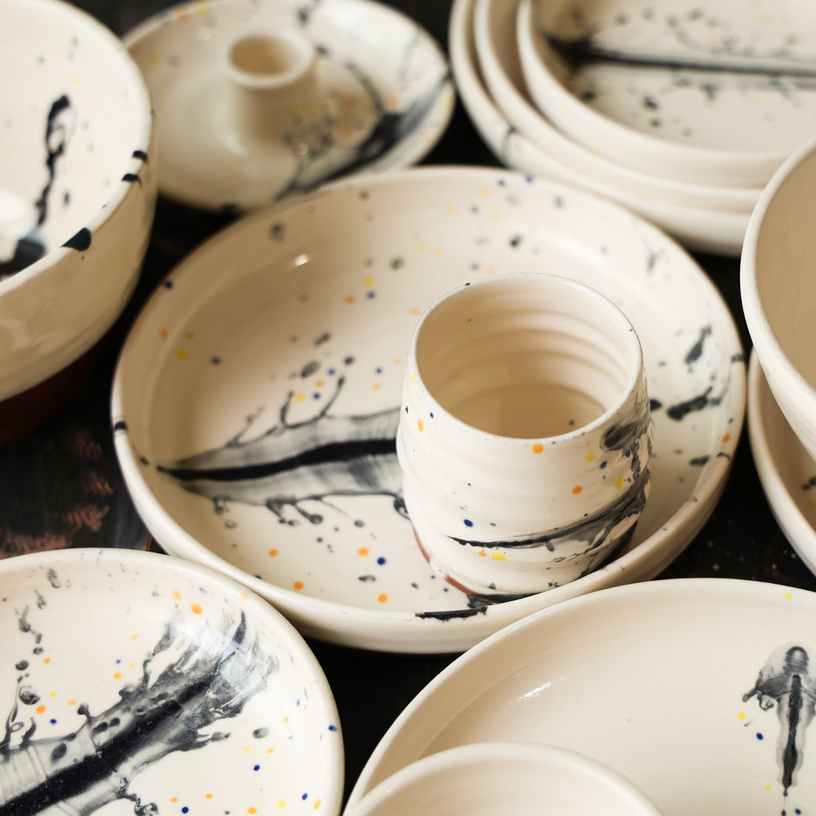 Kevin graduated with a Master's degree from The Royal College of Art. His pottery shop and studio create contemporary slipware featuring beautiful gestural marks influenced by Asian abstract calligraphy.