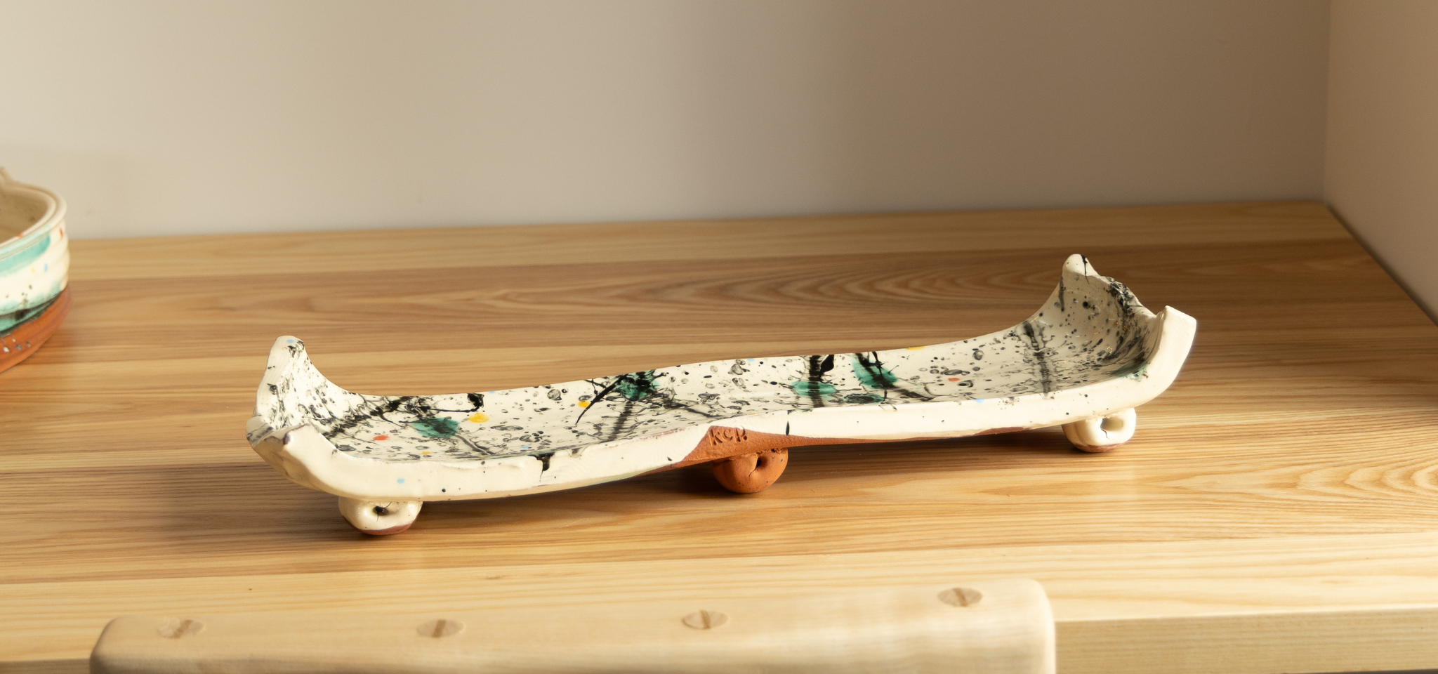 A hand-built ceramic serving plate inspired by traditional Japanese tableware, designed as a sculptural centrepiece for shared dishes. Its long, gently curved form rests on small raised feet, giving the piece a light, elevated presence on the table. The surface is finished in an expressive splatter-glaze of blacks, greens and subtle colour accents on a soft cream base, making every plate completely unique. Ideal for sushi, appetisers, breads or desserts, and just as striking left empty as an art object in the home. Crafted by hand in Donegal — each piece carries the maker’s mark and the natural variations of the kiln.